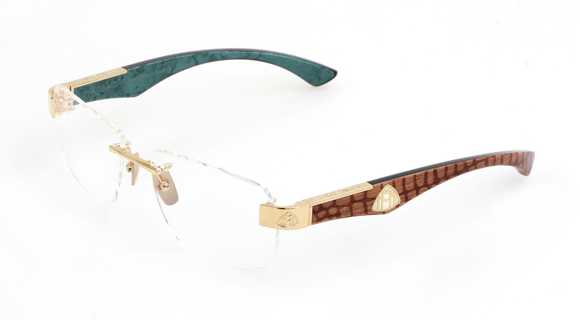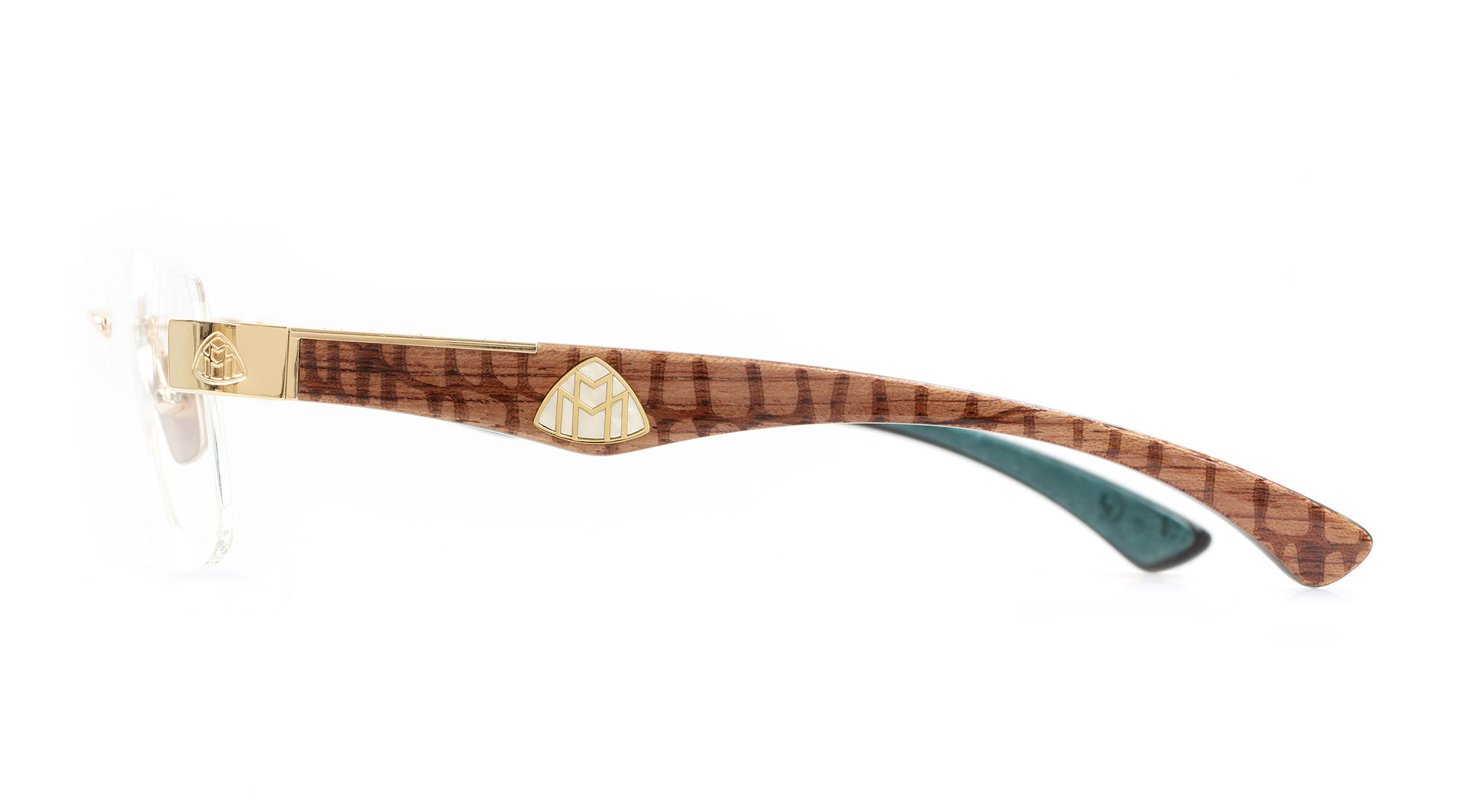 These angular optical glasses are fashioned from ultralight titanium with precious metal plating, partnered by handcrafted temples created from two-tone wood and, depending on the colourway, exclusive carbon. The main focus of THE MAGIC III showcases the striking temple design which displays a selection of extraordinary colour combinations and presents the classic MAYBACH logo in shimmering style with mother-of-pearl insets. Iconic MAYBACH lettering and logos are also found on the end pieces, tops of the temples, and nose pads.